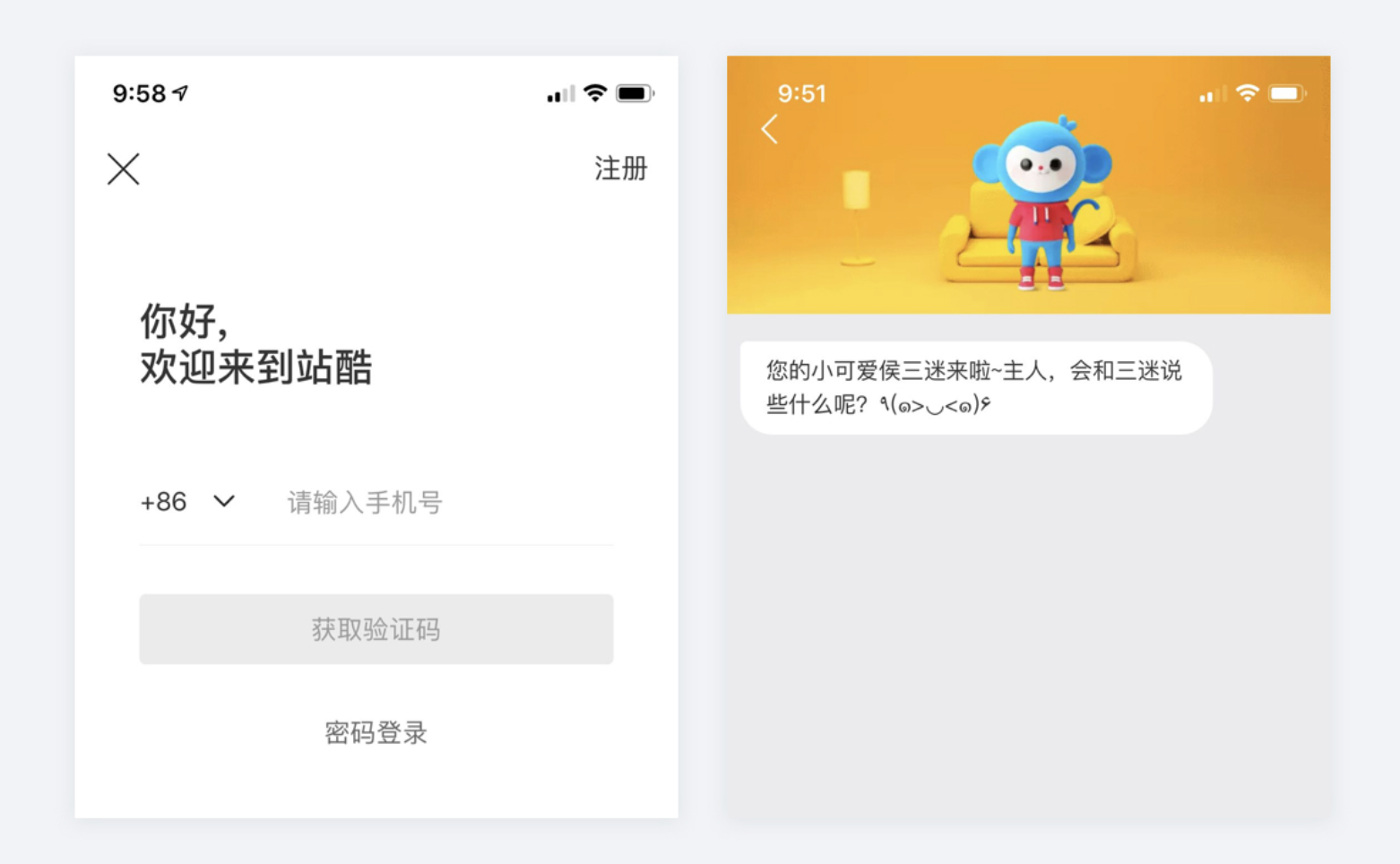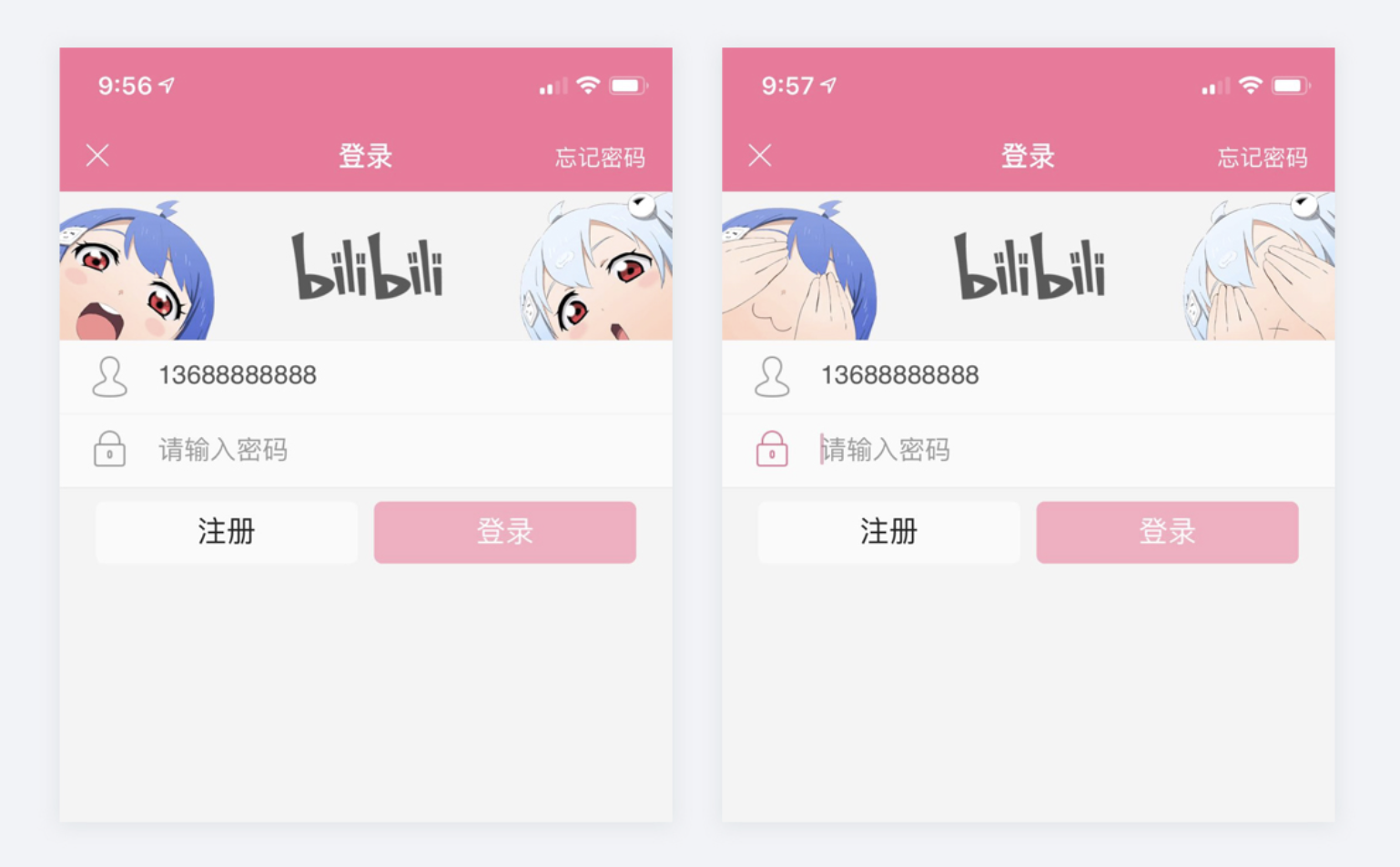 - 有趣的擬人化動(dòng)作設(shè)計(jì):產(chǎn)品作出擬人化互動(dòng)反饋,讓用戶感到有趣,如嗶哩嗶哩 APP 登錄輸入密碼時(shí),IP 形象 22 和 33 會(huì)把眼睛捂起來,給用戶安全感且有趣。