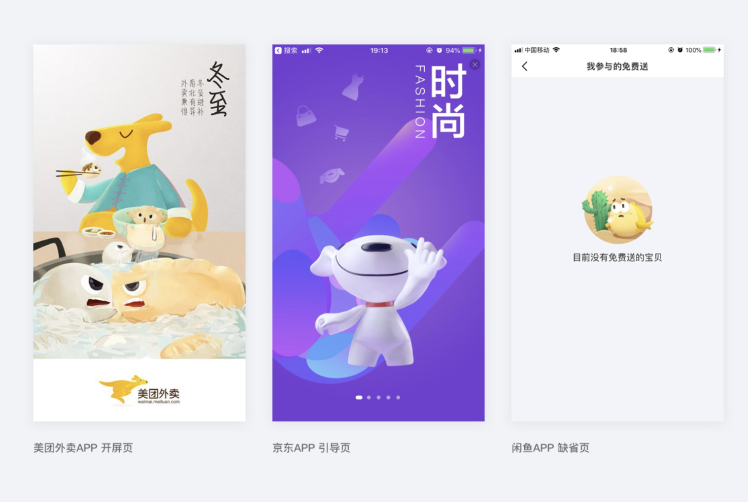 - 獨(dú)特的 IP 形象設(shè)計(jì):識(shí)別度高的 IP 形象帶給用戶親切感,拉近用戶與產(chǎn)品、企業(yè)的關(guān)系,打造品牌效應(yīng)并延展融入日常生活,如美團(tuán)外賣 APP 開屏頁、京東 APP 引導(dǎo)頁、閑魚 APP 缺省頁等展示企業(yè) IP 形象。