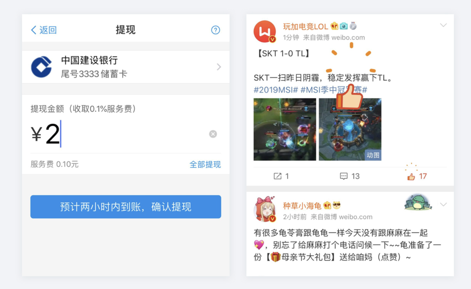 - 符合預(yù)期與超出預(yù)期的設(shè)計(jì):交互設(shè)計(jì)遵循操作前可預(yù)知、操作中有反饋、操作后可撤銷原則,符合用戶預(yù)期并增加超出預(yù)期反饋,如支付寶 APP 提現(xiàn)預(yù)先告知到賬時(shí)間,微博 APP 點(diǎn)贊彈出點(diǎn)贊圖標(biāo)小動(dòng)畫。