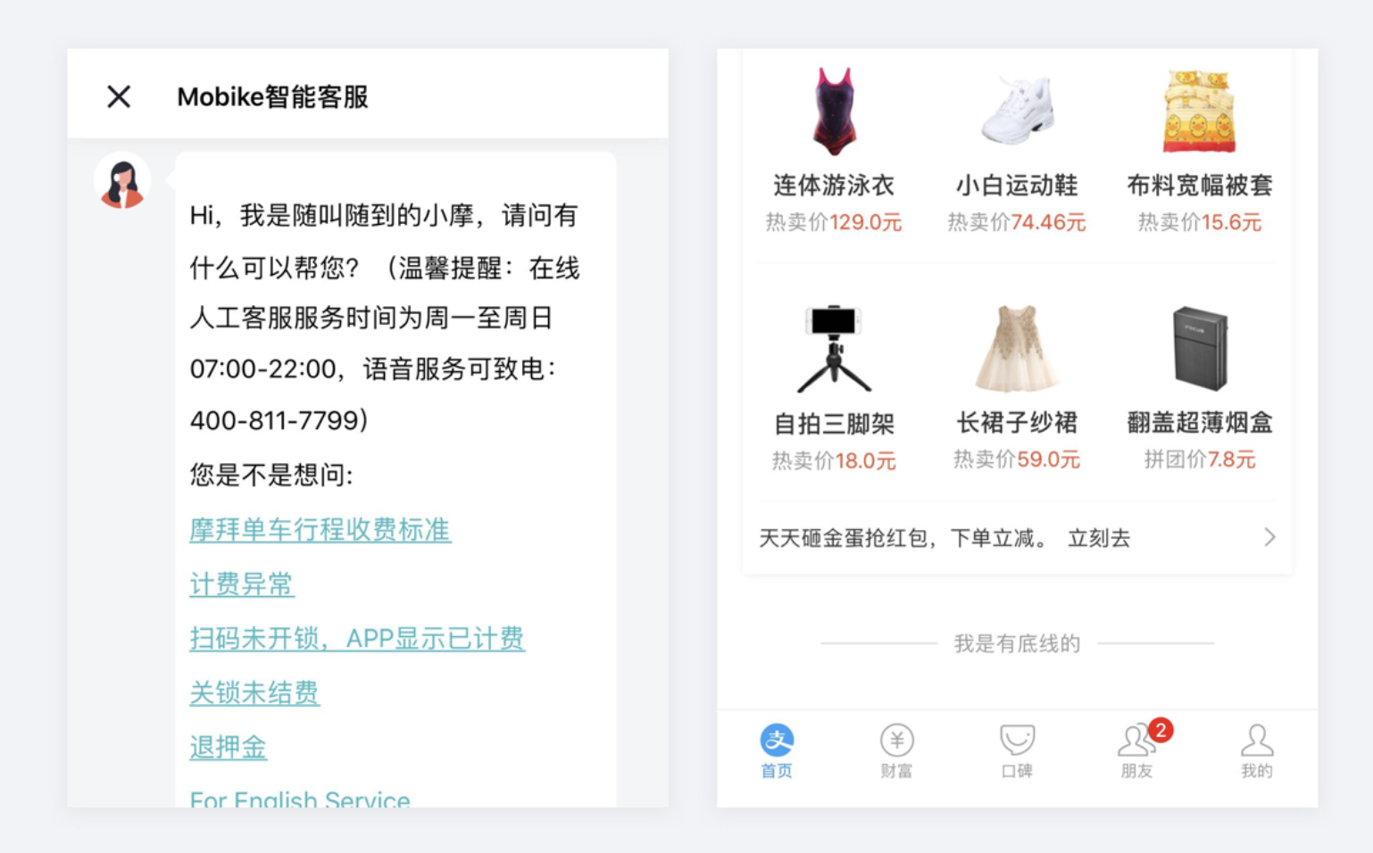 - 明確服務(wù)者定位的設(shè)計(jì):站在服務(wù)者角度,以親近方式與用戶溝通,讓用戶感受產(chǎn)品溫度,如摩拜單車 APP 在線客服用 “您” 稱呼用戶,支付寶 APP 用 “我是有底線的” 幽默文案拉近關(guān)系。