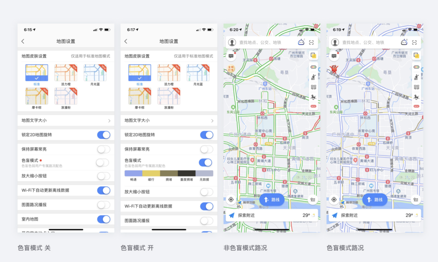 - 無障礙化的設(shè)計(jì):重視服務(wù)特殊人群的設(shè)計(jì),體現(xiàn)人文關(guān)懷和產(chǎn)品合理性、智能性,如高德地圖 APP 為色盲人群提供專屬路況信息顏色開關(guān)并可隨意編輯顏色。