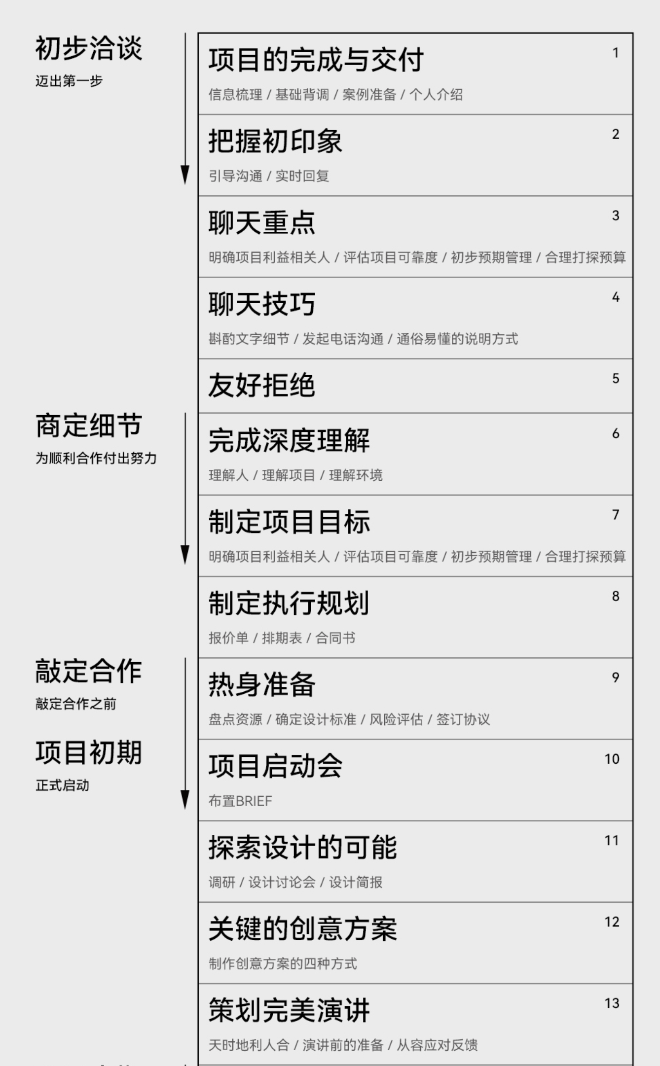 3. 敲定合作(敲定合作之前):完成對項目相關(guān)人員、項目本身及環(huán)境的深度理解;制定項目目標(biāo)和執(zhí)行規(guī)劃(包括報價單、排期表、合同書);做好熱身準(zhǔn)備,如盤點(diǎn)資源、確定設(shè)計標(biāo)準(zhǔn)、進(jìn)行風(fēng)險評估及簽訂協(xié)議。