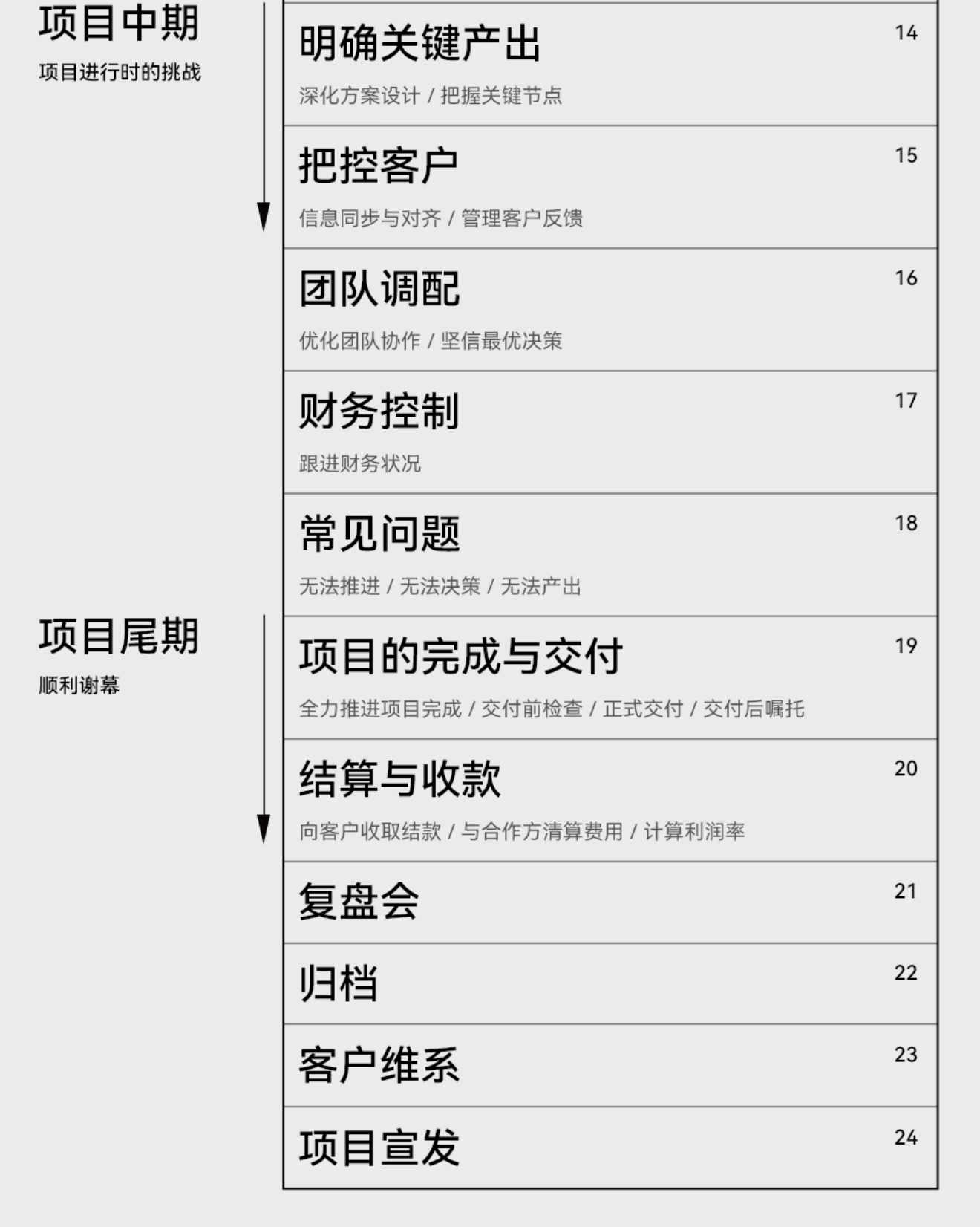 5. 項目中期(項目進(jìn)行時的挑戰(zhàn)):明確關(guān)鍵產(chǎn)出,深化方案設(shè)計并把握關(guān)鍵節(jié)點(diǎn);把控客戶方面,做好信息同步與對齊,管理客戶反饋;進(jìn)行團(tuán)隊調(diào)配,優(yōu)化協(xié)作并堅信最優(yōu)決策;做好財務(wù)控制,跟進(jìn)財務(wù)狀況;應(yīng)對常見問題,如項目無法推進(jìn)、決策受阻、產(chǎn)出困難等。