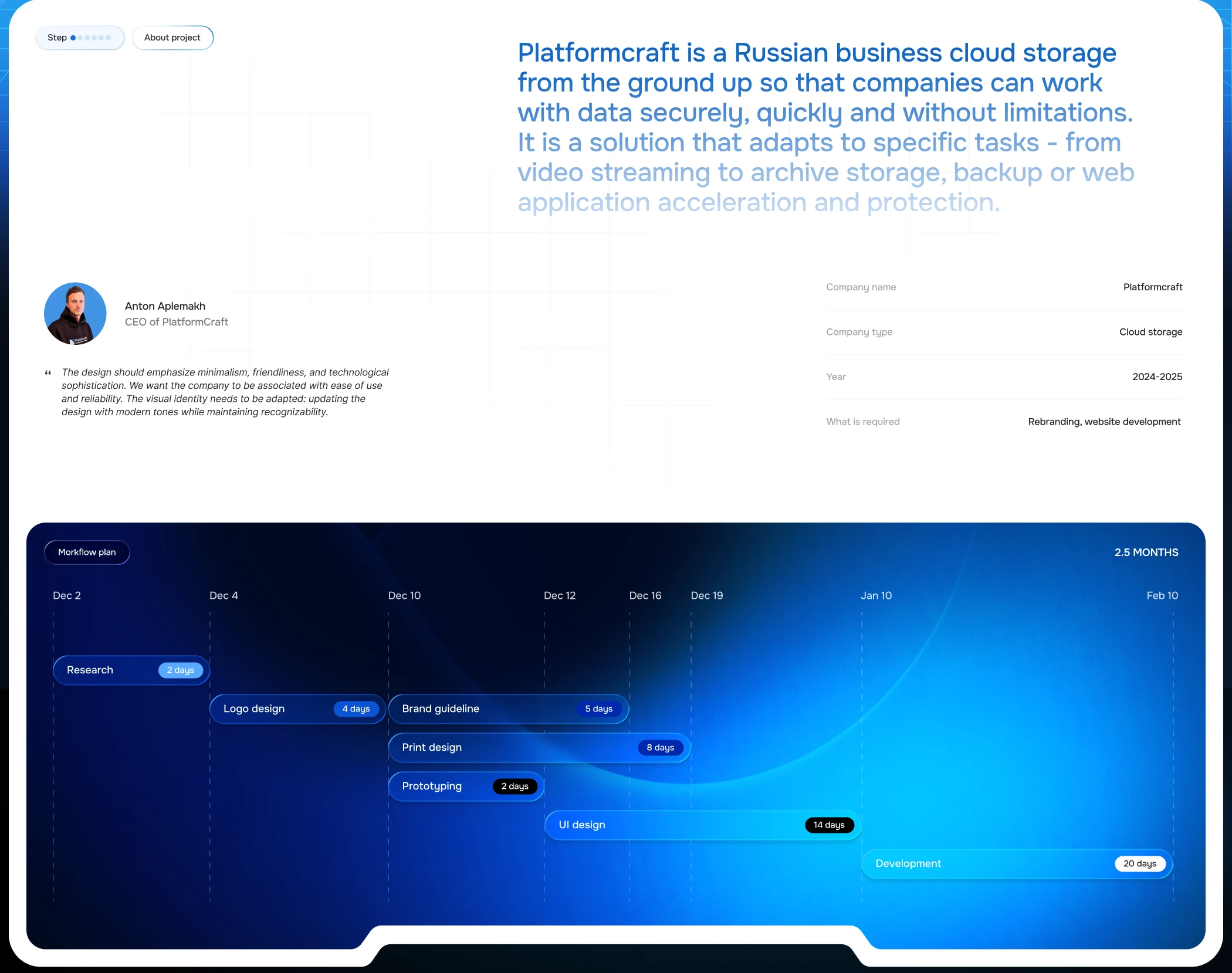 Platformcraft 是一款來自俄羅斯的商業(yè)級云存儲產品,致力于為企業(yè)提供穩(wěn)定、安全且高效的文件管理與協作服務。其品牌視覺以字母“P”與云的圖形結合為核心,簡潔而富有科技感,象征著平臺(Platform)與云端(Cloud)之間的高度融合。