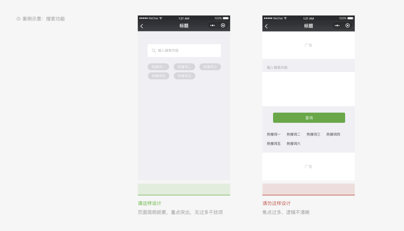 - 重點(diǎn)突出:頁面需簡明,聚焦核心內(nèi)容,避免多焦點(diǎn)干擾。例如搜索功能應(yīng)減少無關(guān)熱搜詞,多按鈕設(shè)計需明確主次(如主操作按鈕突出,輔助操作弱化);