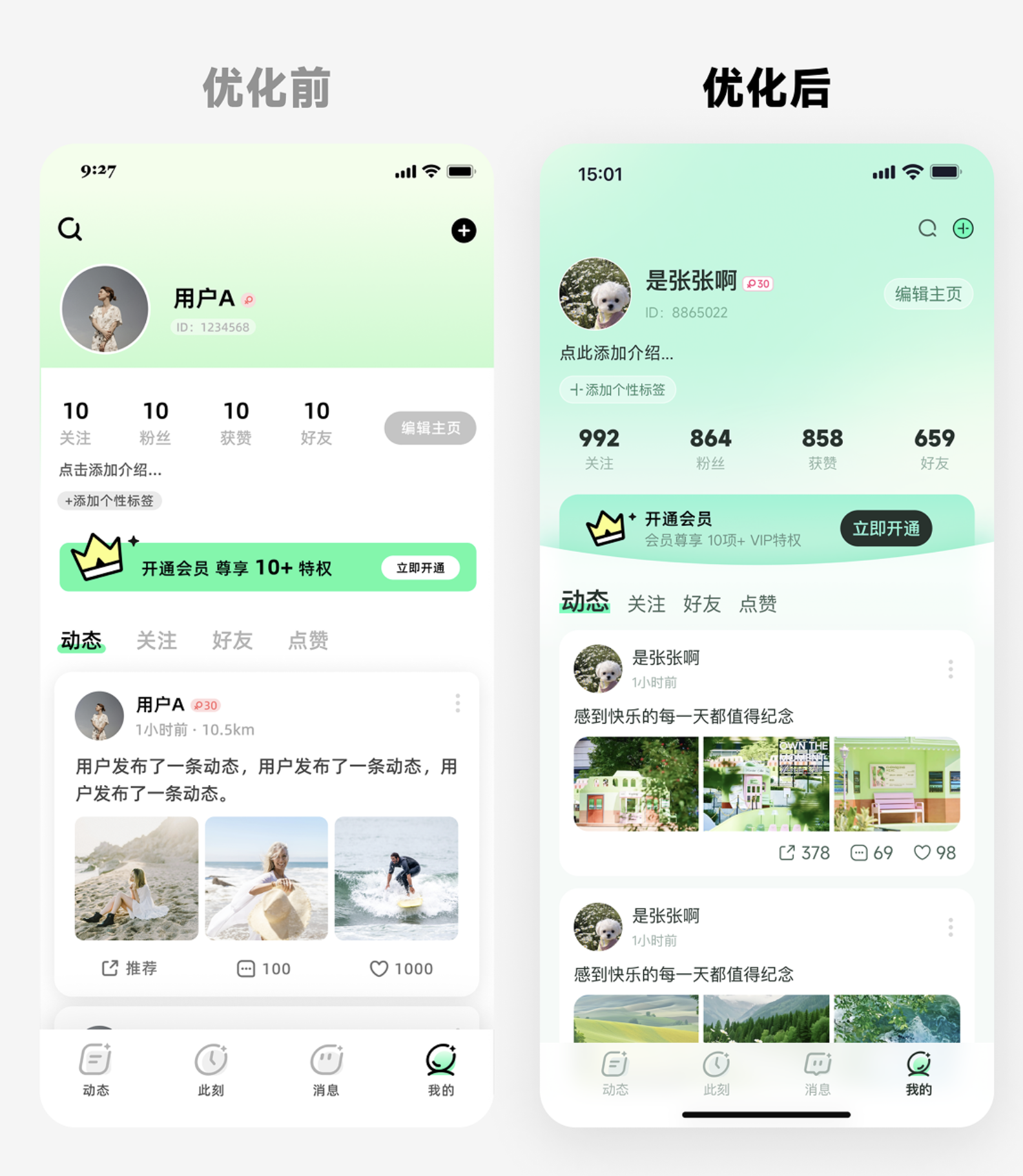 改完后,用戶掃一眼就能捕捉到核心數(shù)據(jù),比之前的 “扁平展示” 精致多了,還能間接提升用戶的社交認(rèn)同感。