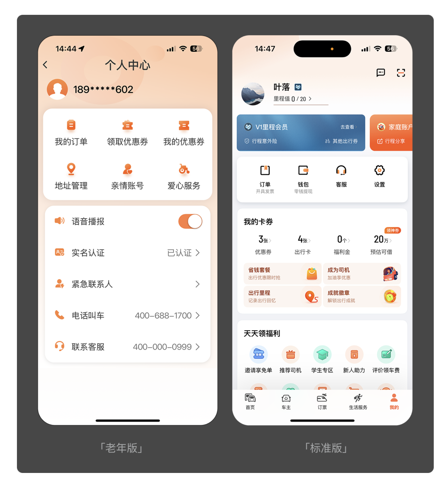 清晰的界面是老人順利操作的基礎(chǔ)。老年用戶的視覺敏感度下降,過小的字體、密集的圖標(biāo)、復(fù)雜的排版都會給他們帶來困擾。滴滴老年版將主要功能模塊以大字體、高對比度的圖標(biāo)形式呈現(xiàn),摒棄了標(biāo)準(zhǔn)版中繁雜的附加服務(wù)入口,讓 “打車” 這一核心功能一目了然;淘寶老年版則聚焦老人常用的 “購物、訂單、客服” 功能,隱藏了百億補貼、直播帶貨等復(fù)雜板塊,用簡潔的布局和醒目的文字,降低了視覺識別成本。好的適老化界面設(shè)計,就像給產(chǎn)品 “畫重點”,讓老人無需費力尋找,就能快速定位所需功能。