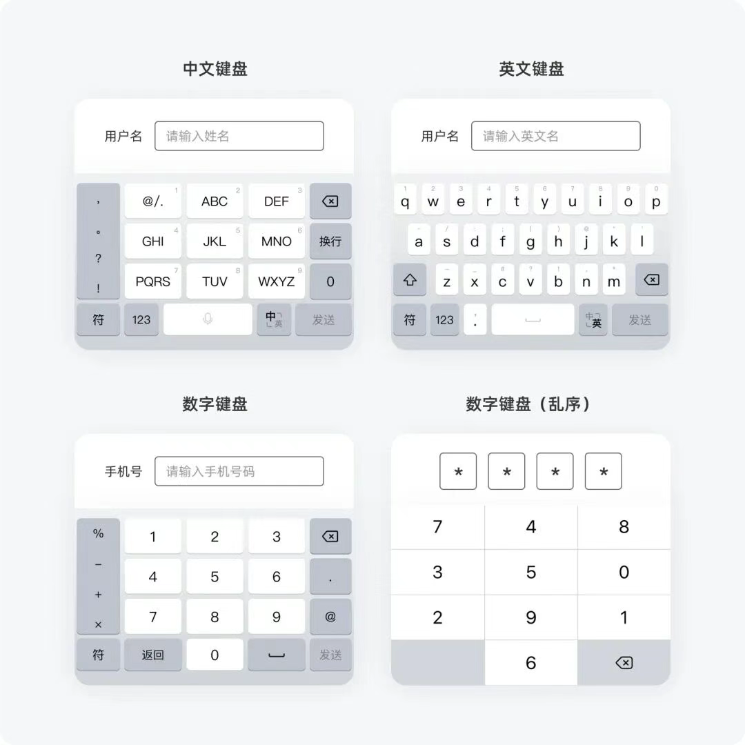 為了簡化數(shù)據(jù)輸入,滿足不同的類型的文本輸入需求,用戶在輸入不同類型的字段時(shí),應(yīng)提供對(duì)應(yīng)類型的鍵盤,便于用戶更快完成表單內(nèi)容,常見的鍵盤有以下幾種: