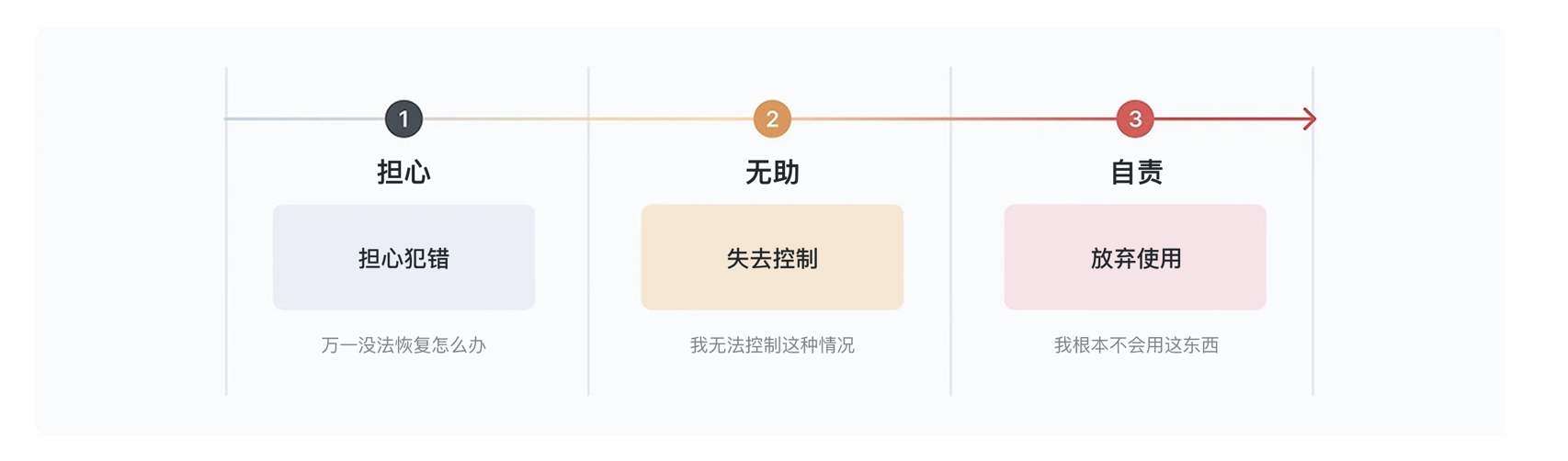 要化解錯誤帶來的負面影響,首先需要讀懂錯誤背后的邏輯與用戶心理。從類型上看,用戶出錯可分為 “失誤” 與 “錯誤” 兩類:失誤多是執(zhí)行階段的無意識行為,比如分心時點錯按鈕、輸入時打錯字符;錯誤則源于規(guī)劃階段的判斷偏差,往往是界面信息混亂、層級模糊導致用戶誤解功能。無論哪種情況,用戶出錯后的心理反應高度一致:擔心操作不可逆的恐懼、失去對流程掌控感的無助,以及將問題歸咎于自身的自責,而自責感正是導致用戶放棄使用的核心誘因。尤其在操作不可逆(如刪除數據、注銷賬號)、反復失?。ㄈ绲卿洺瑫r、表單校驗不通過)或高風險場景(如支付轉賬、數據傳輸)中,用戶的焦慮感會被急劇放大,對產品的信任度也會隨之崩塌。